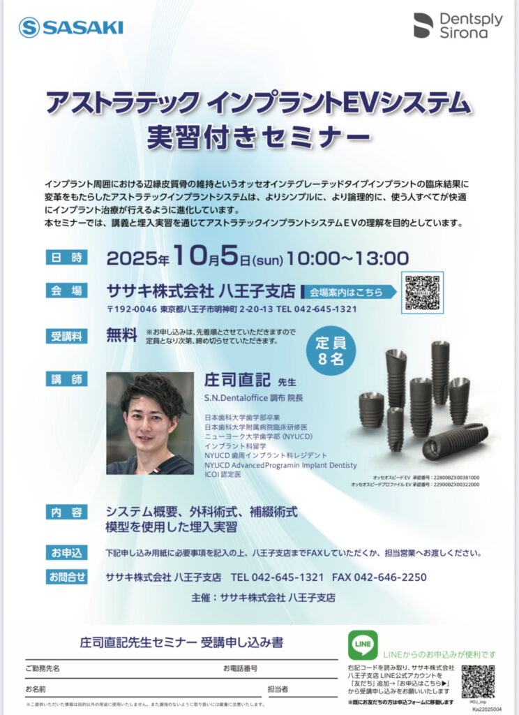 当院院長、庄司直記がアストラテック インプラントEVシステム実習付きセミナーに登壇いたします。